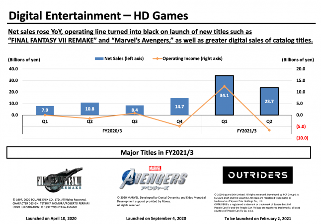 Digital Entertainment is further broken down into MMO and HD Game categories, and that’s where the seeming impact from Marvel’s Avengers reveals itself. The MMO segment on its own looks to be going strong: it saw a slight decline in sales year-over-year due to competition from last year’s major Final Fantasy XIV expansion launch, though operating income is up year-over-year due to strong subscriber numbers in FFXIV.